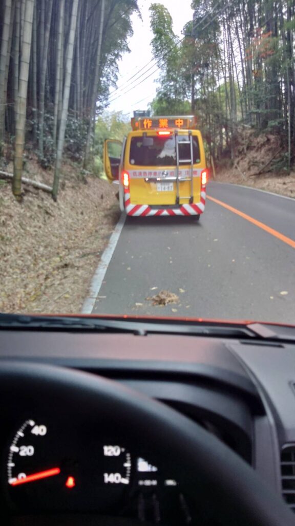 路肩に止まって貰って・・・道野~白木に抜ける道の陥没について、聞いた所・・